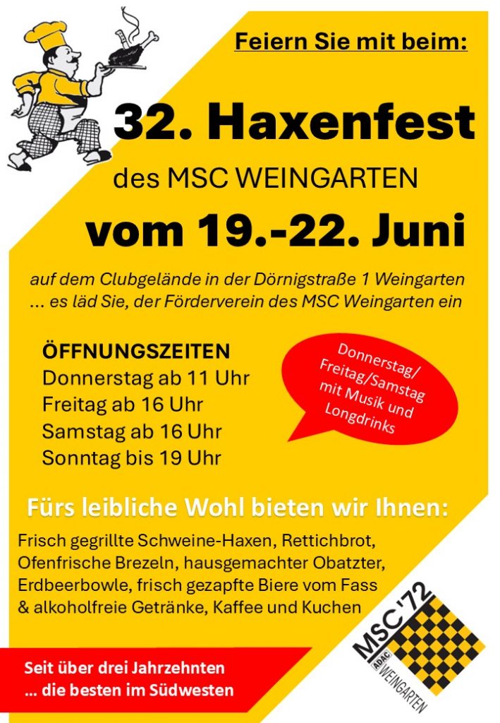 Der MSC Weingarten lädt alle Freunde, Familien und Motorsportfans herzlich zu unserem traditionellen Haxenfest ein! Vom 19. bis 22. Juni 2025 feiern wir bereits das 32. Mal dieses beliebte Fest, das für gute Laune, leckeres Essen und gesellige Stunden sorgt.